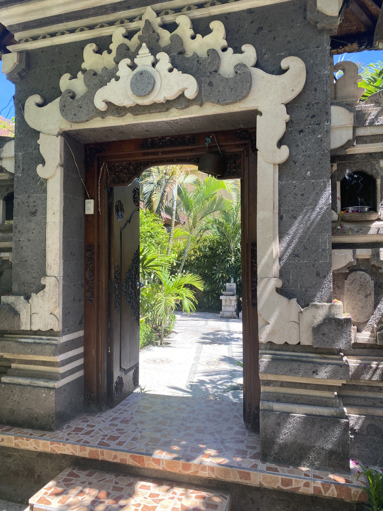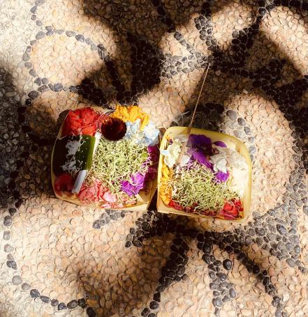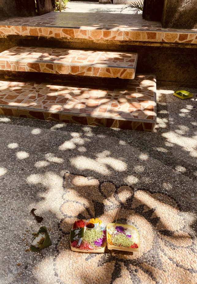 We are finding these small woven baskets made from palm leaves filled with flowers, rice and other items on the ground everywhere we go. We have learned that this is a daily practice to express devotion and to honour the beauty and balance of life. These offerings are called “canang sari” and are a cultural tradition rooted in Balinese Hinduism, symbolizing gratitude and respect in daily offerings to gods and spirits, maintaining harmony between the physical and spiritual worlds.