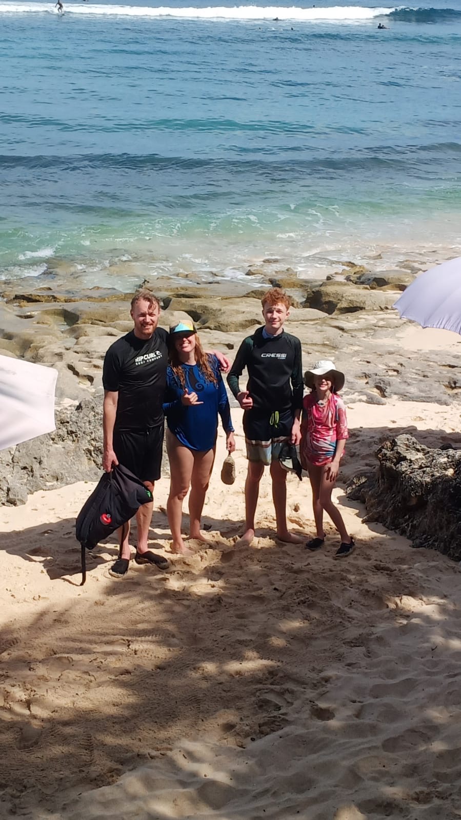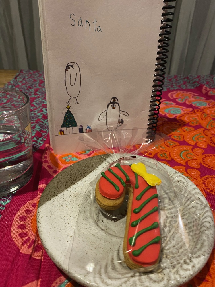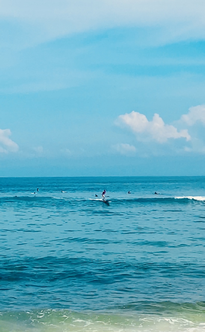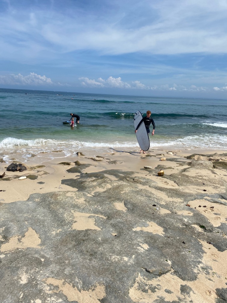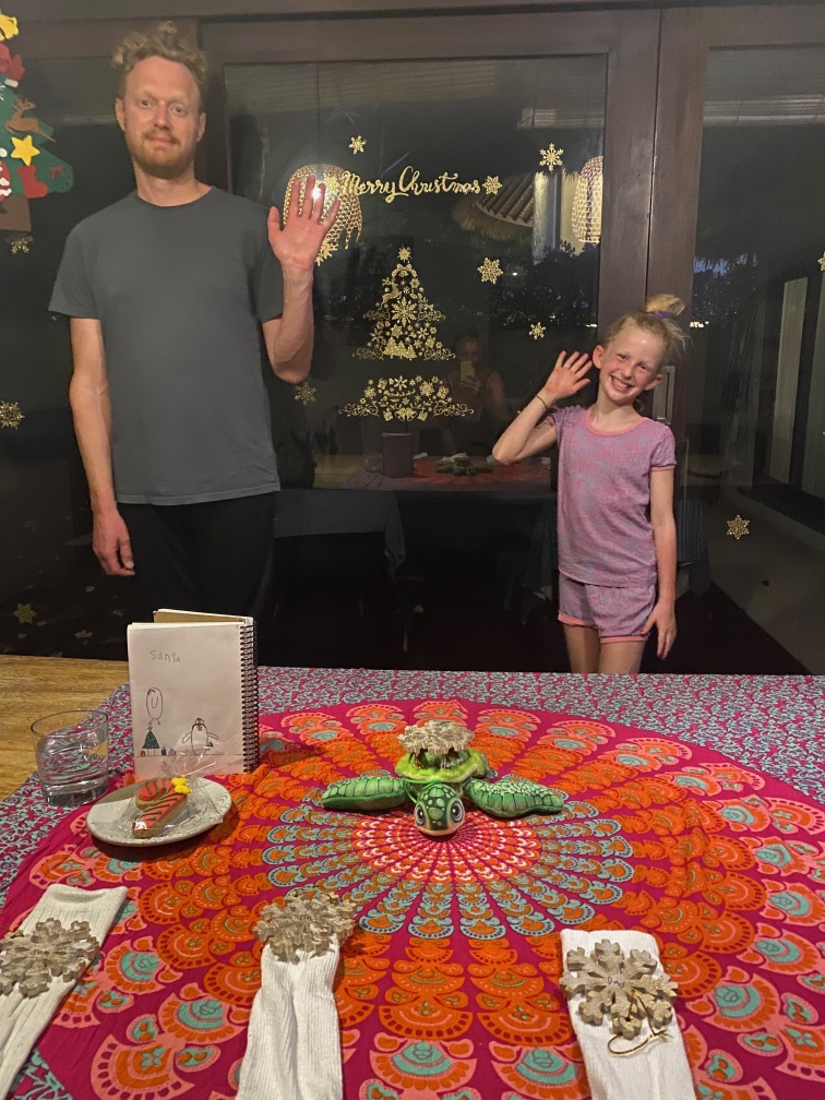 Krista and Ella enjoying the crystal bluegreen waters of Padang Padang.Swimming is a favorite family activity! So glad we found this local spot.We scoured local markets for Xmas themed items. We found this “tree” and decorations made of felt. It’ll have to do! 🎄Also we found some window stickers and wooden snowflake decorations. Finley volunteered some socks for stockings 😄Kimo the cat admires our awesome stockings.Candy cane cookie for the big guy, of course!Woo hoo, Santa came to Bali! We figured that since we’re closer to the international date line, we get the first delivery and therefore, the best loot.Santa gave us swimming goggles!And cookies, yum!Ella got a Bali purse.In Bali, after opening presents, you go surfing!Everyone stood up on the first day, amazing!We had a very enthusiastic local surf guide, who helped us with board rentals and showed us where to go. An hour went by fast.We had the best time surfing, can’t wait to go again!BaliXmas was very cool. Feeling very grateful for this fun time together.