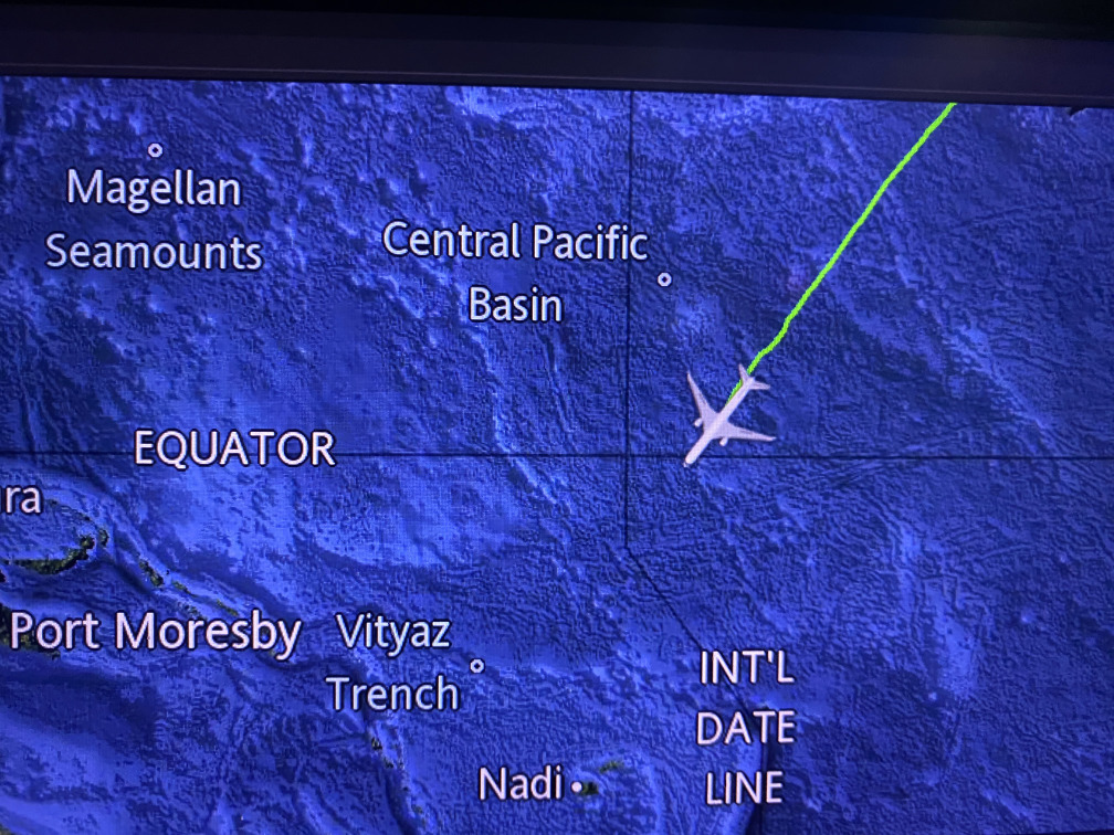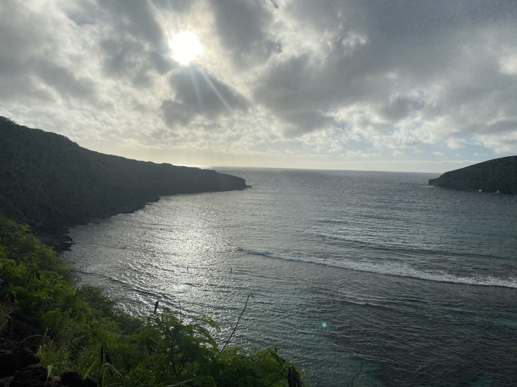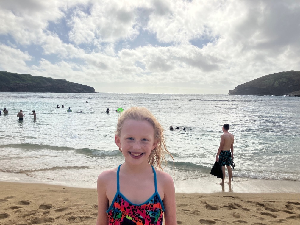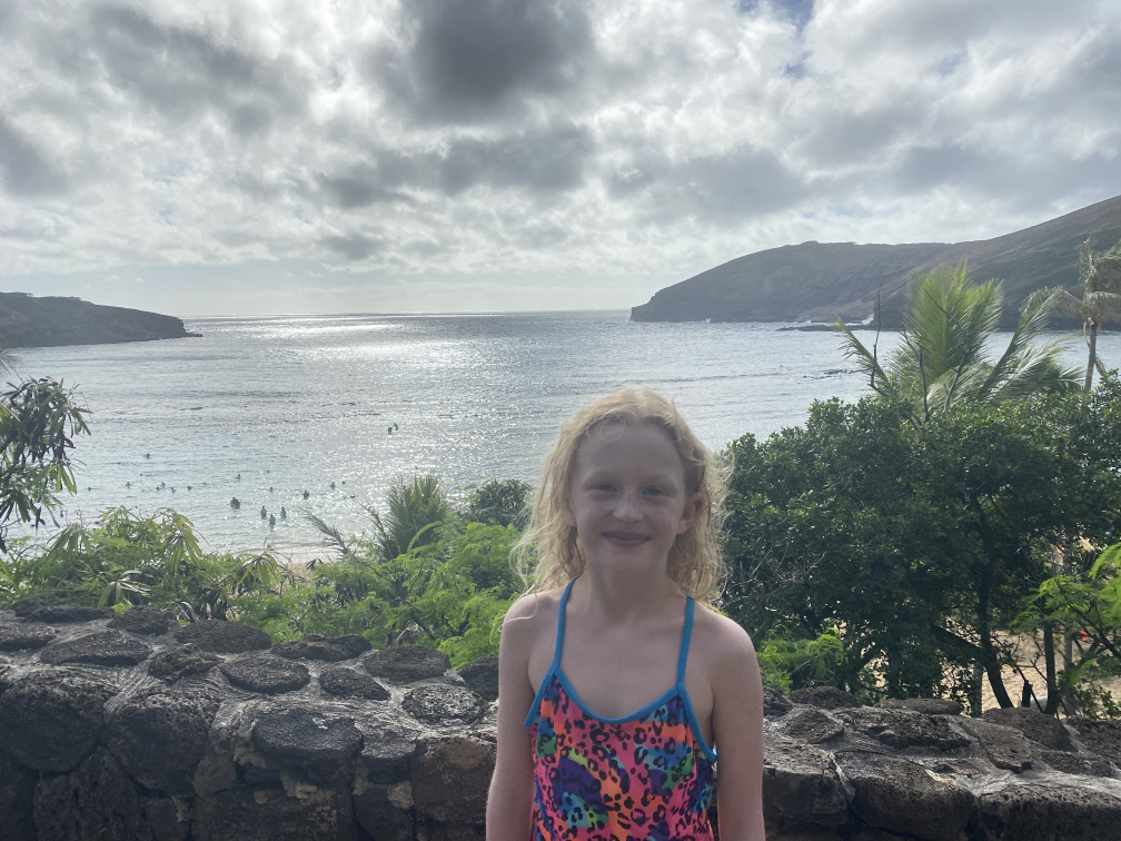 Good morning Hanauma Bay!There’s a gentle walk from the visitor’s center down to the bayMore suspcious birds, a whole tree of them. Are they following us?Ella ready to snorkel!We love snorkelling!We all snorkeled with great enthusiasm. Fin takes a break.As we were leaving, the sky cleared upWe loved Hanauma Bay! Snorkeling was the best.The next day a 10 hour flight to Sydney, Australia! We crossed the equator and the international date line around the same time.