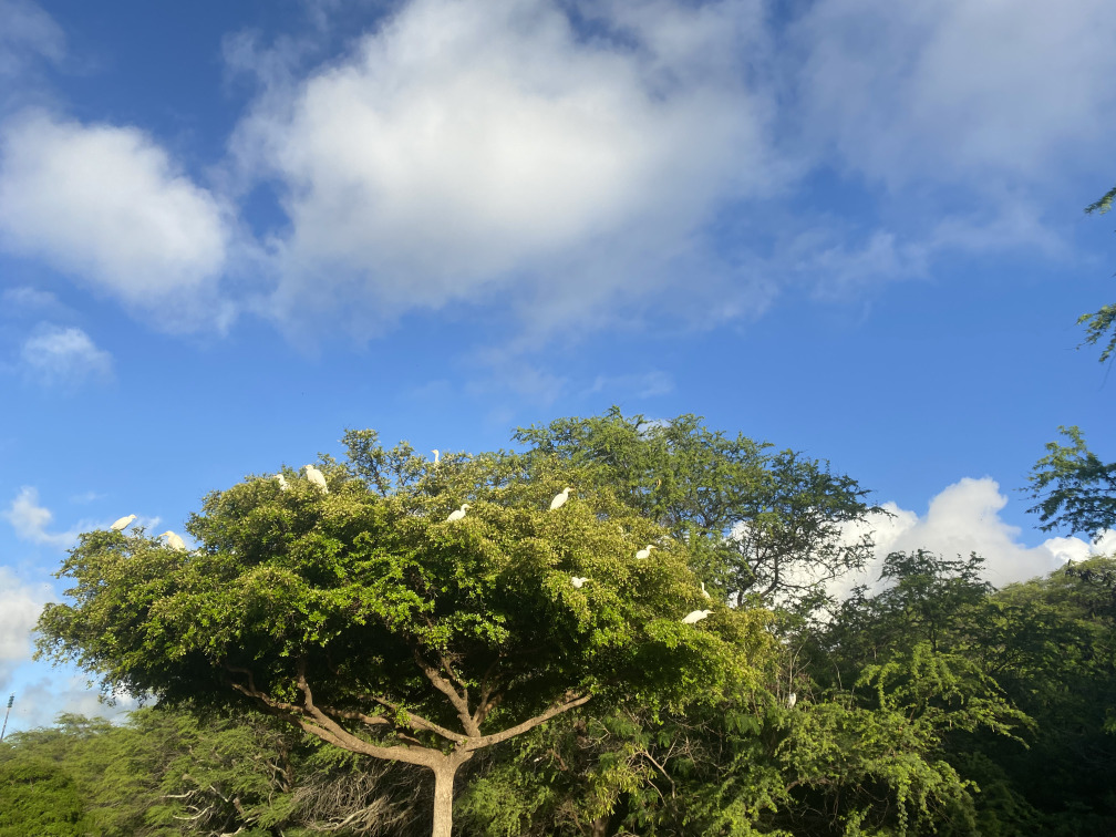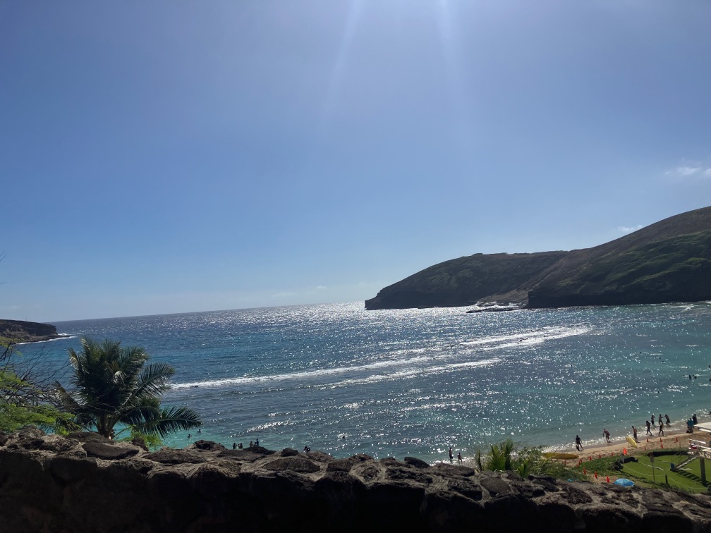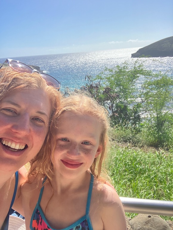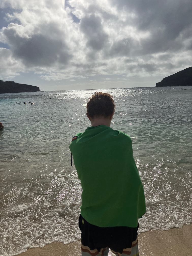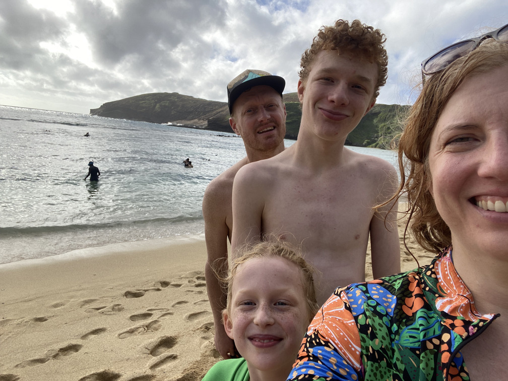 Good morning Hanauma Bay!There’s a gentle walk from the visitor’s center down to the bayMore suspcious birds, a whole tree of them. Are they following us?Ella ready to snorkel!We love snorkelling!We all snorkeled with great enthusiasm. Fin takes a break.As we were leaving, the sky cleared upWe loved Hanauma Bay! Snorkeling was the best.The next day a 10 hour flight to Sydney, Australia! We crossed the equator and the international date line around the same time.