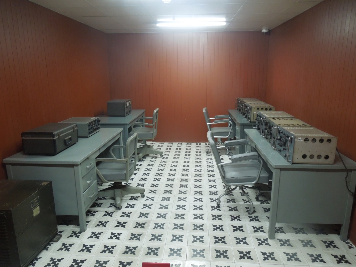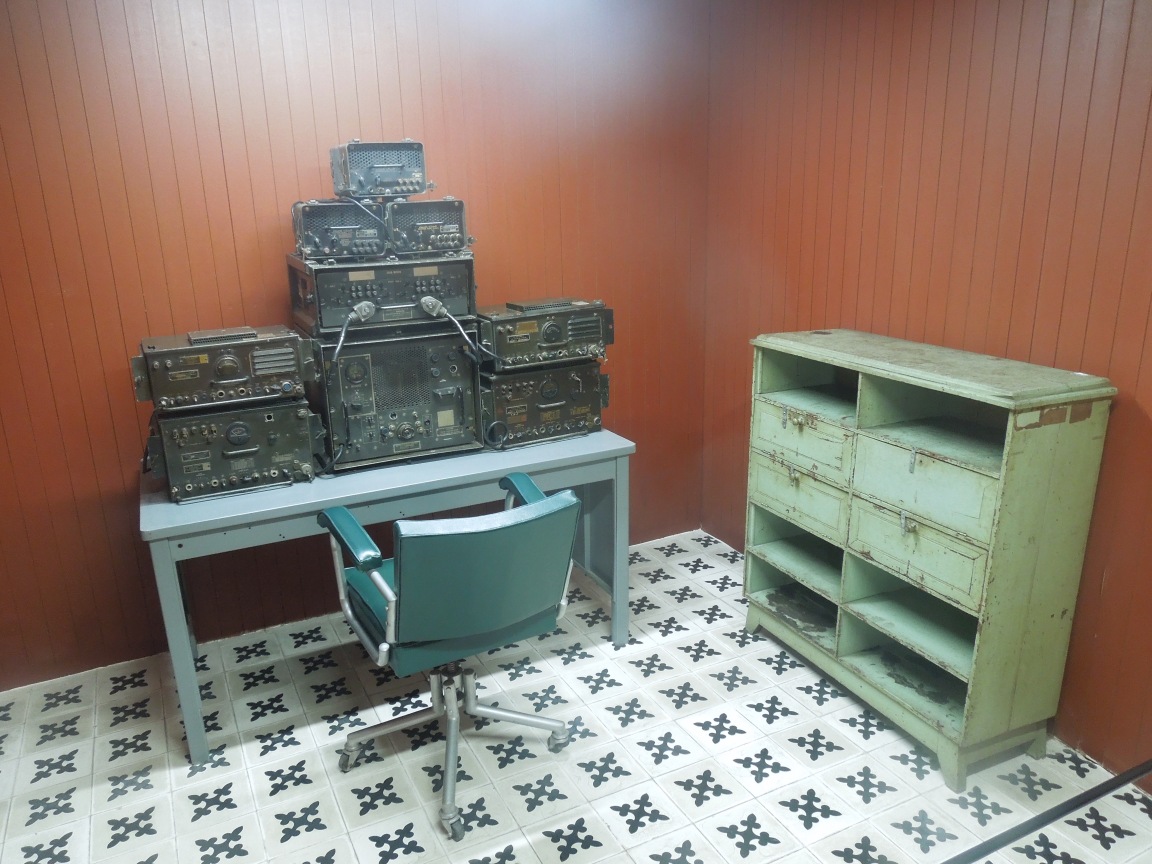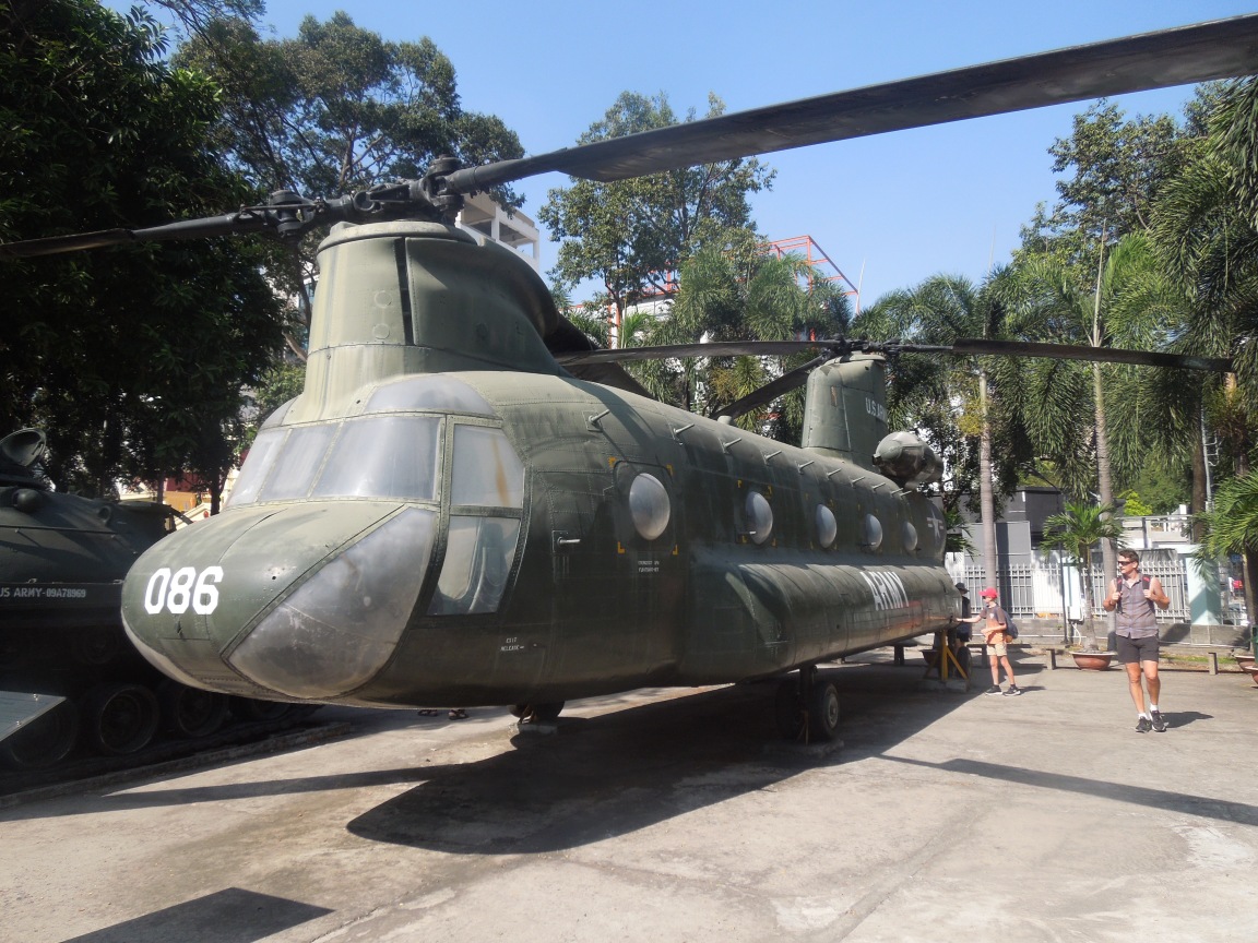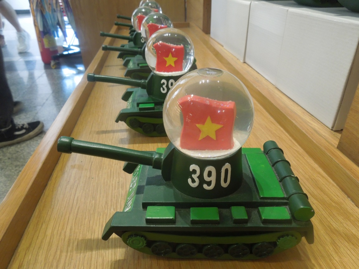 The wide driveway is lined with Vietnamese flags.Inside, each of the palace’s grand rooms is preserved in the style in which it was decorated in the 70s. There are rooms for entertaining official state guests and for meetings of the cabinet.The basement of the palace contains a bunker and communications center for the president and his staff. This was the most interesting part of the building!The old US-supplied communication equipment has all been preserved.The president’s Mercedes Benz W110 is there too.A replica of the North Vietnamese tank that crashed through the palace gates, marking the end of the Vietnam War.The nearby War Remnants Museum features a variety of captured US military vehicles, including this Chinook helicopter.The gift shop sold these decidedly unique snow globes, for the revolutionary in your life who has everything.
