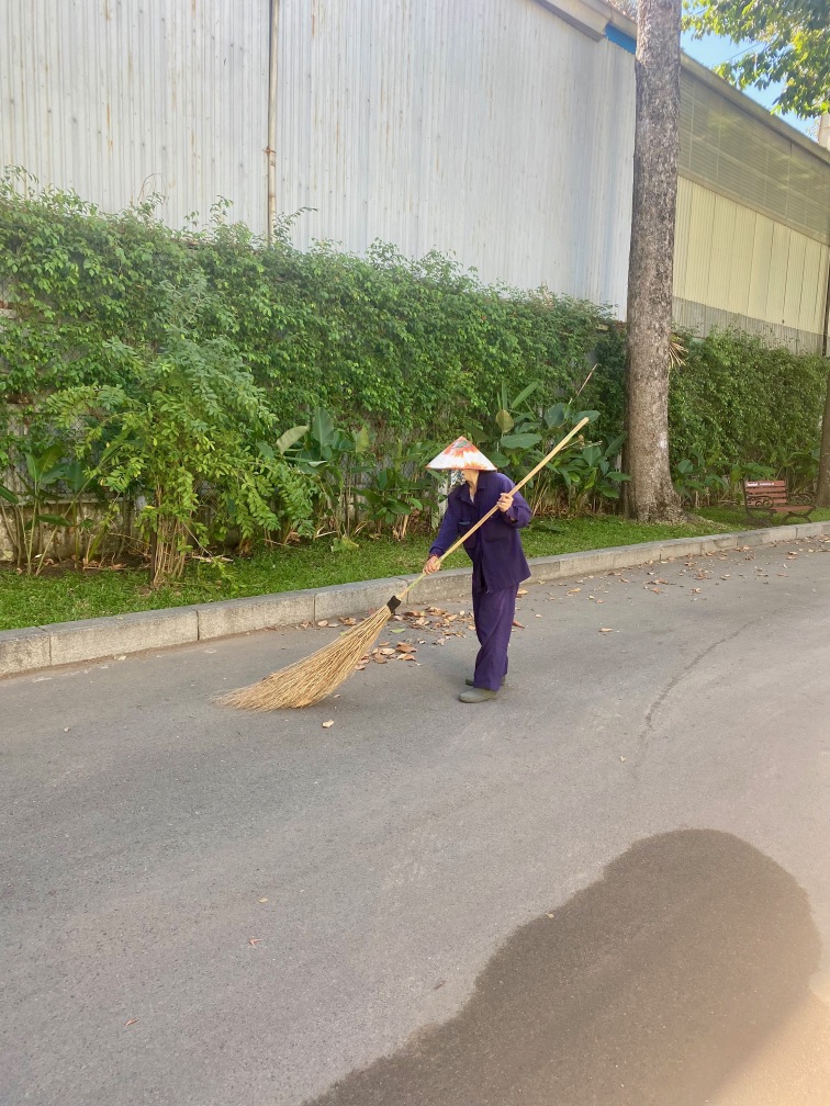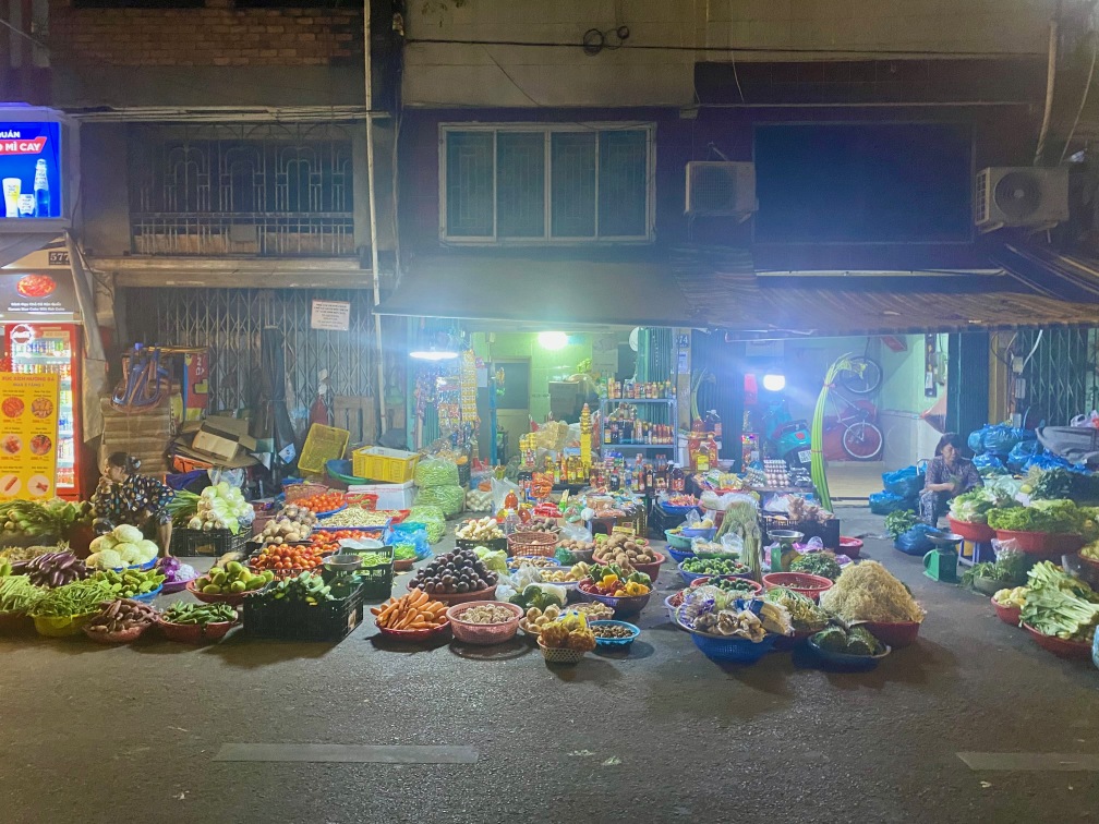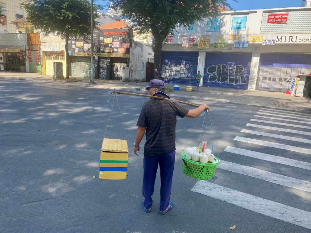 Cleaning up in style - purple outfit, conical hat, grass broom, check!Fresh coconut guy charges tourists way too much, but the sweet sweet cold coconut water is so good we don’t care!Saigon street supermarket. In this city, everything happens on the street.