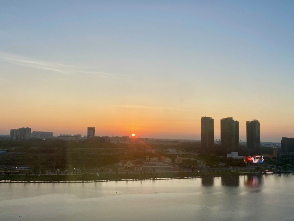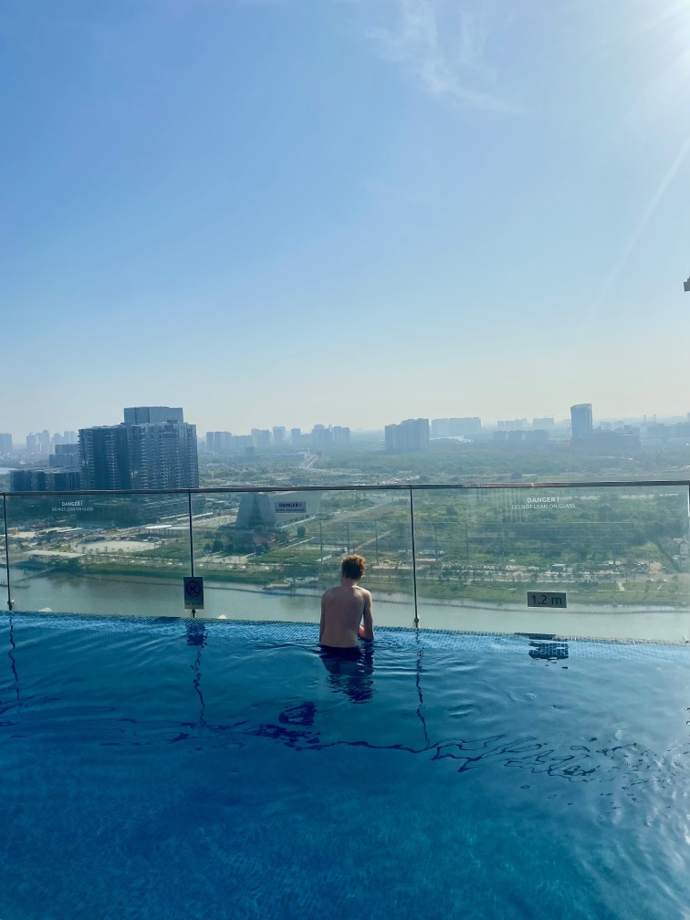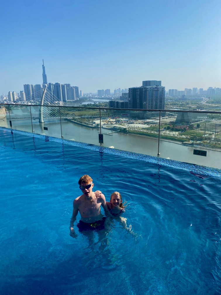 Our 16th floor hotel room had a magnificent view of the river, and the rising sun shone directly at our window every morning. At dawn we would feel the temperature rise as our room’s AC struggled to keep up with the hot Vietnam sun.Every night a giant jumbotron-type screen across the river showed messages about Tet and ads for beer. The park across the street was full of families every night celebrating the holiday.The boulevard in front of our hotel would get jammed with motorbikes every evening, to the point that they would overflow onto the sidewalk. It seemed like the busiest street in all of Saigon.Our hotel had a great rooftop pool.It was a nice break from the heat.