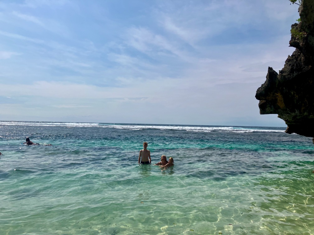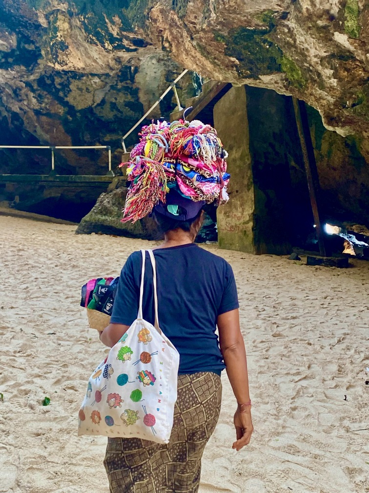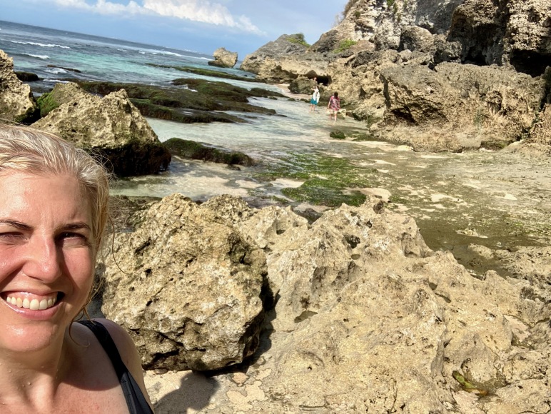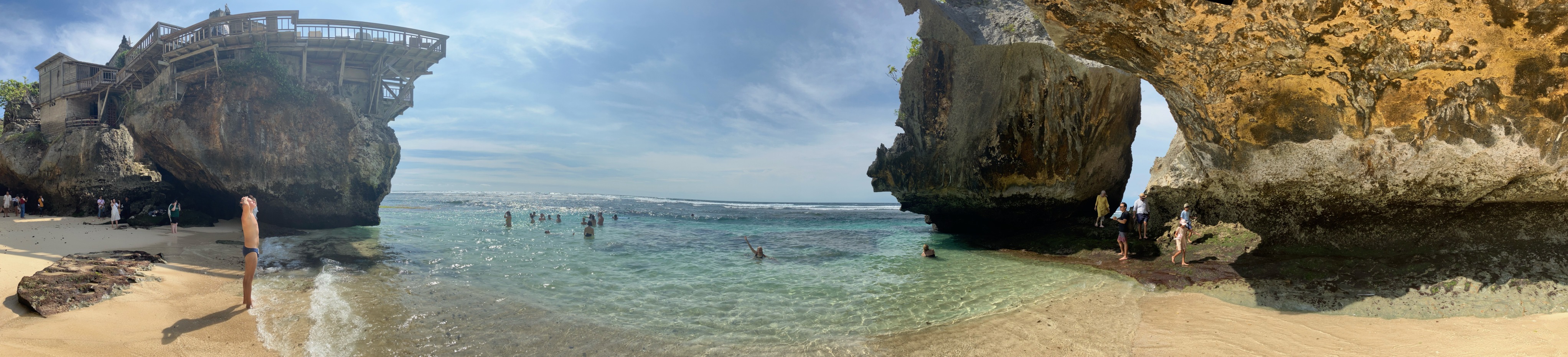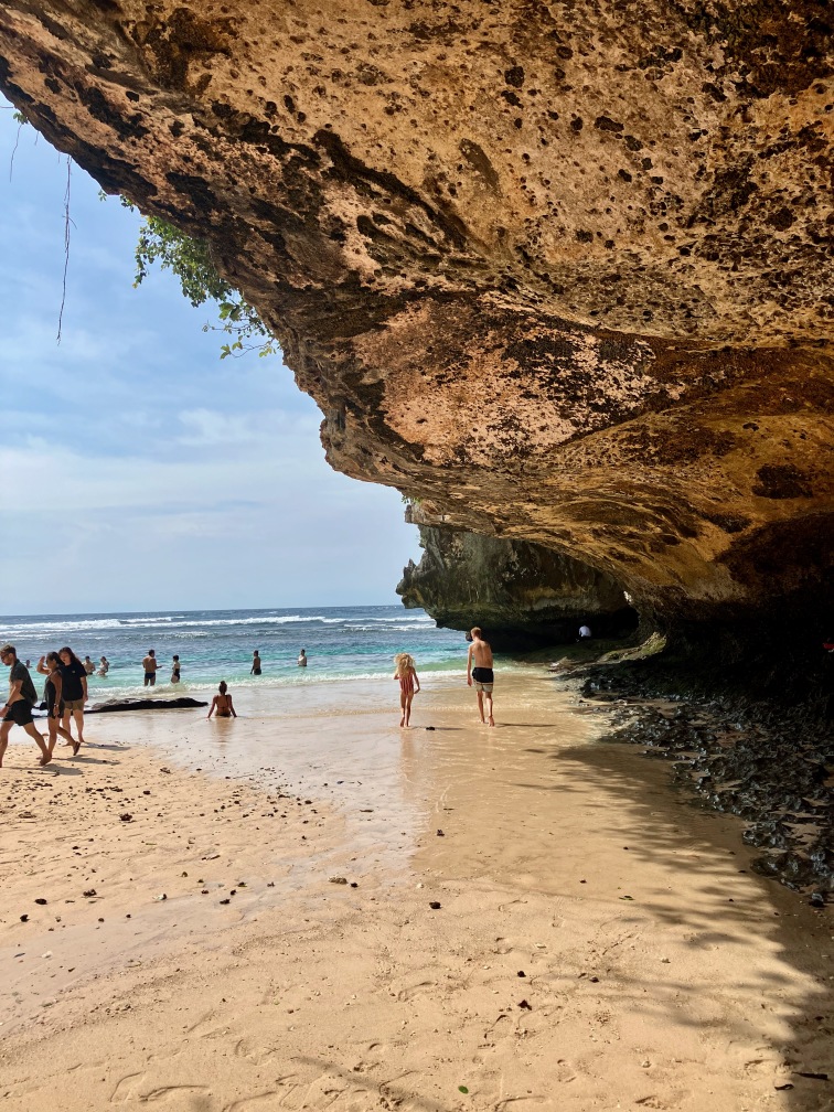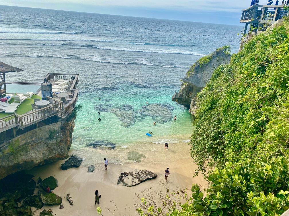 Uluwatu Beach is a narrow strip of beach at the southern tip of Bali between two cliffs, which is only accessible at low tide.